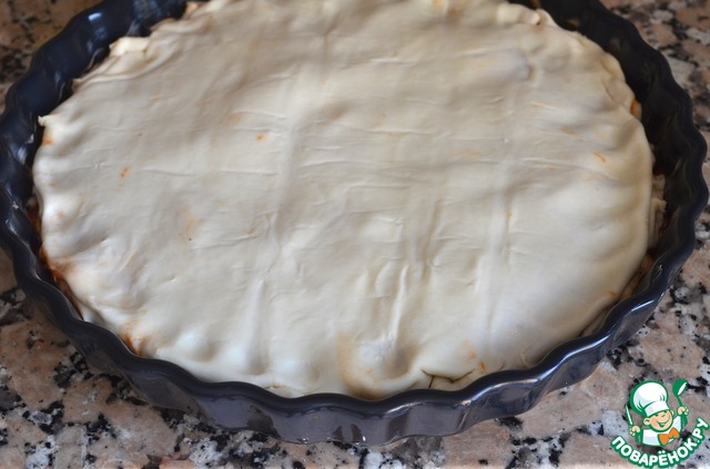 5. Накрыть тестом, подоткнуть края и поставить в духовку на 10 минут. Затем снизить температуру до 200 и готовить пирог еще 15-20 минут, пока тесто не станет хрустящим и золотистым. Дать остыть в форме 2 минуты, перевернуть на доску или тарелку, посыпать тертым пармезаном и подавать со свежим салатом.