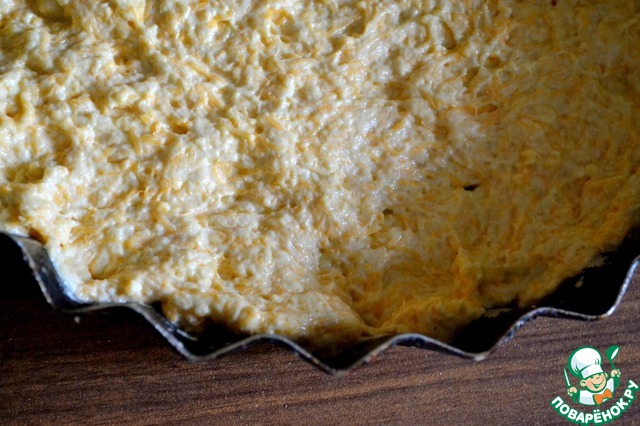 Потом кладем его в смазанную форму, растягиваем пальцами и формируем бортики.