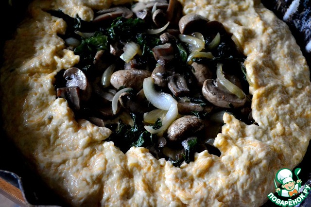 Грибы, лук и шпинат жарим до готовности на растительном масле, добавляем по вкусу соль и перец.