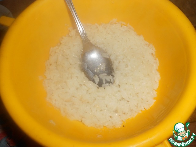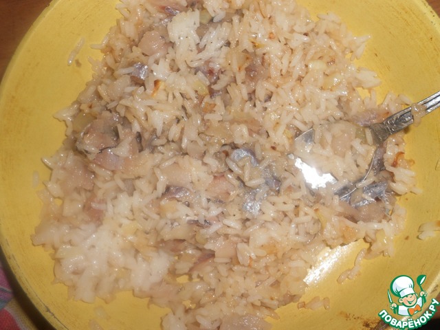 Добавить к луку отварной рис, соевый соус, перемешать.