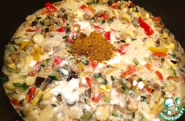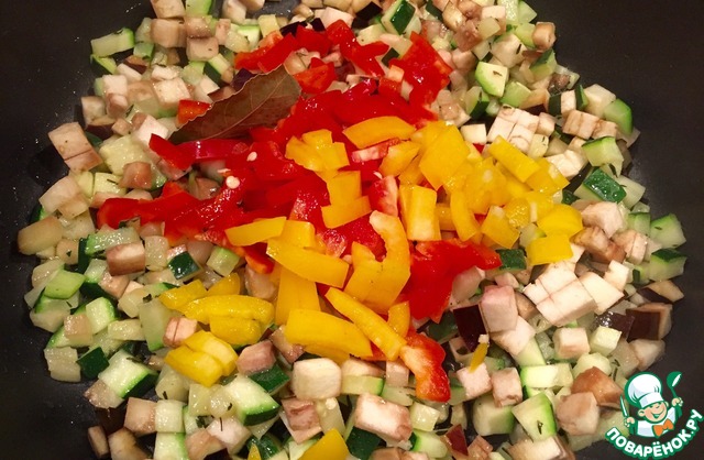 Добавляем кубиком нарезанный баклажан и 2 цвета перца!