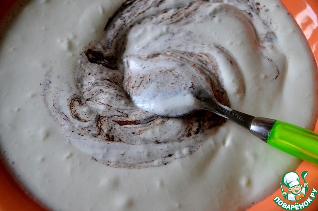 Добавляем желтки, тщательно перемешиваем. Вводим оставшиеся взбитые сливки. Перемешиваем очень осторожно, чтобы мусс не опал - движениями снизу вверх.