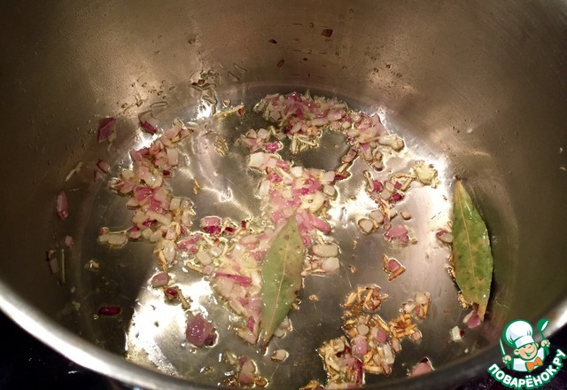 Приступим. В глубокой Кастрюле подогреть оливковое масло. Выложить мелко нарезанный лук, натёртый чеснок и лавровый лист.