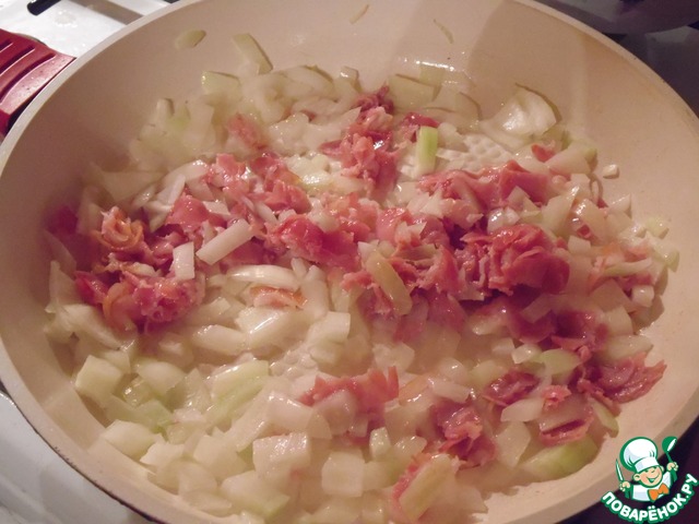Лук мелко нашинковать, обжарить на растительном масле до прозрачности. Бекон нарезать небольшими кусочками, добавить к луку, обжарить 2–3 минуты.