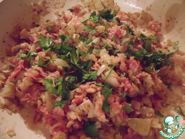 Петрушку нашинковать, перемешать с начинкой.