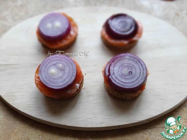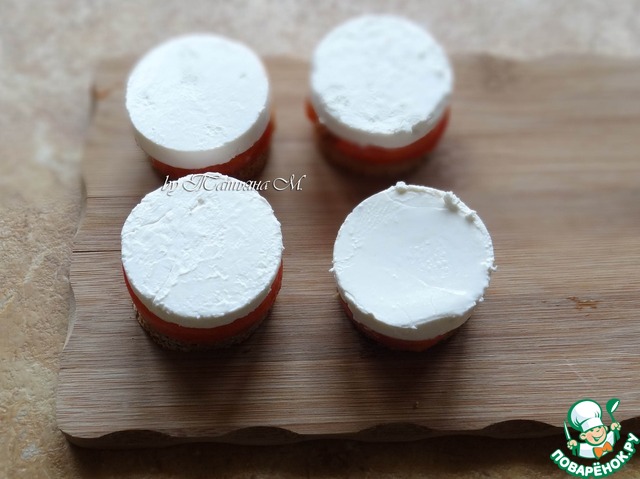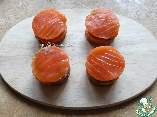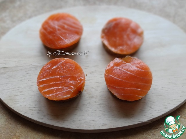 На хлебцы выложить семгу, вырезанную тем же диаметром;