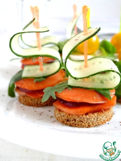 На семгу положить лист руколы, затем шпажкой проткнуть волнообразно слайс огурца и установить шпажку по середине канапе, проткнув его до конца;