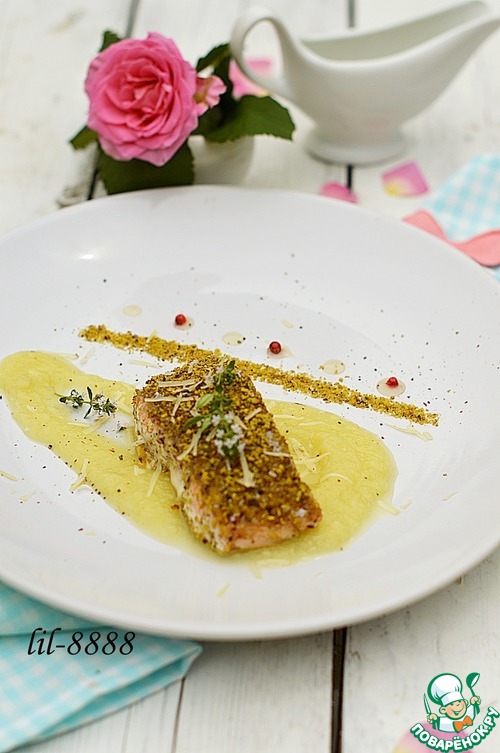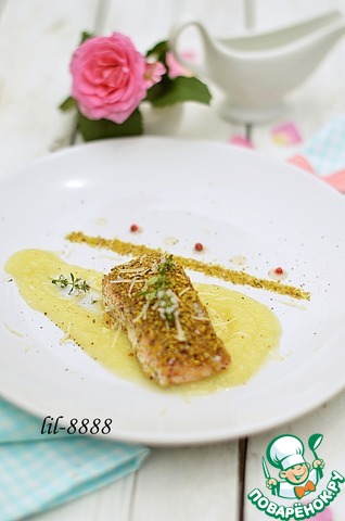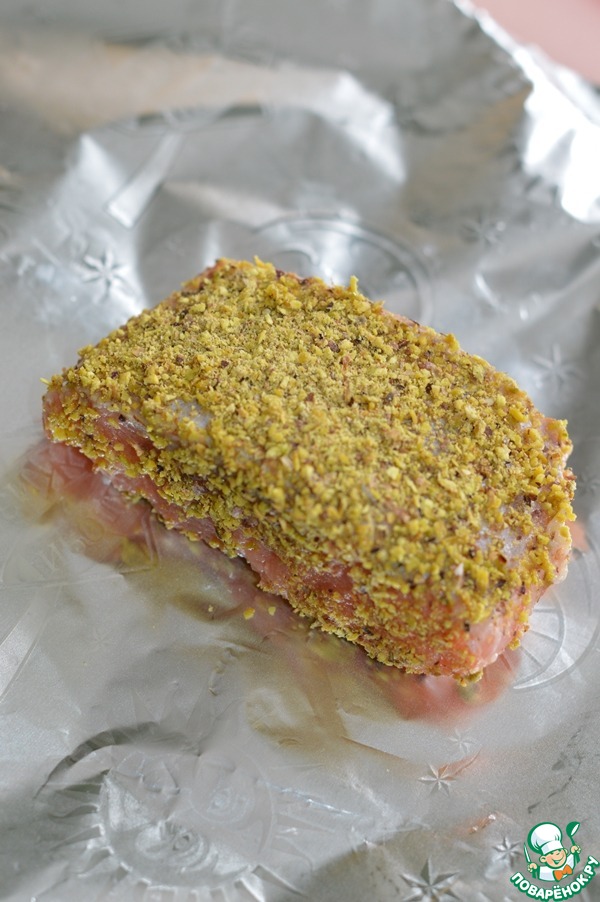 1. Духовку разогреть до 180С. Рыбу натереть солью, перцем и маслом. Выложить на фольгу, посыпать верх фисташками. Запечь 5-7минут, в зависимости от величины куска.