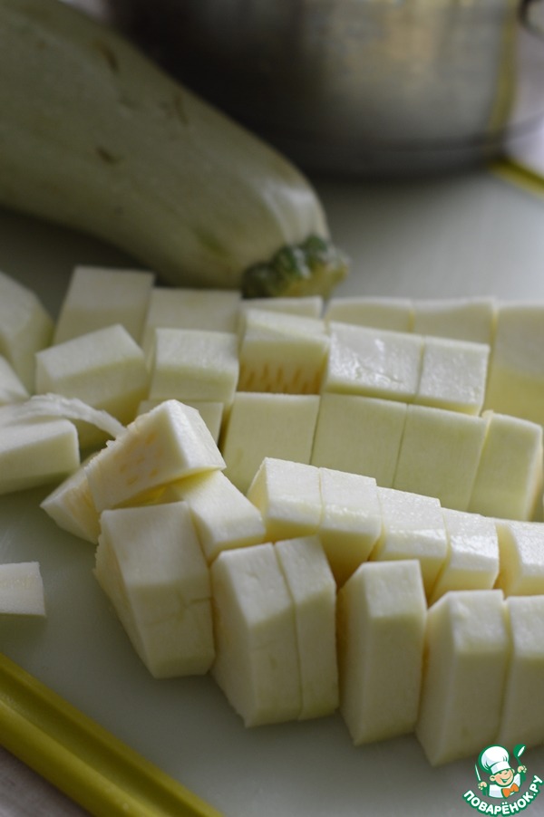 2. Кабачок почистить от кожуры, нарезать кубиком, отварить в небольшом количестве воды до мягкости.