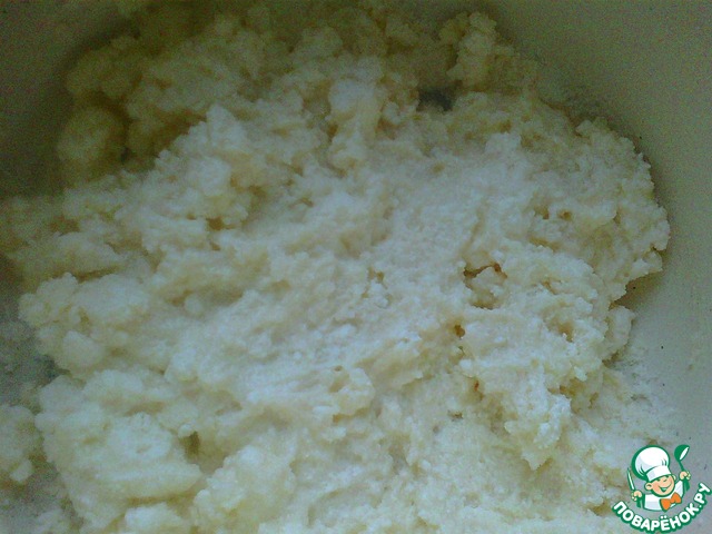 Растереть творог с сахаром и яйцом.