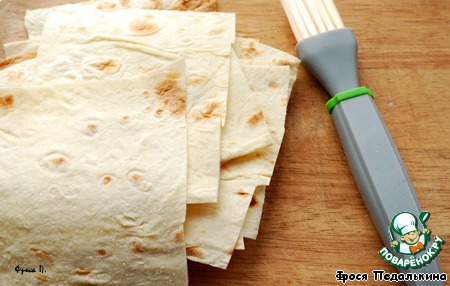 Лаваш нарезать квадратами 10*10 см. Смазать квадраты с обеих сторон растительным маслом.