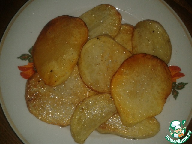 Начнем с приготовления картошки: Чистим пару картошин и нарезаем их кружочками, после чего разогреваем сковороду и обжариваем до золотистой корочки. Только не переборщите что бы не хрустели. Можно совсем чуть, чуть подсолить.