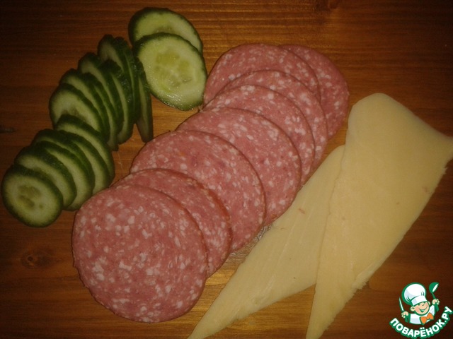Далее нарезаем огурец, колбасу и сыр. Сыра можете положить и чуть больше. Но я не люблю когда все плавает.
