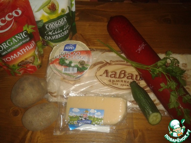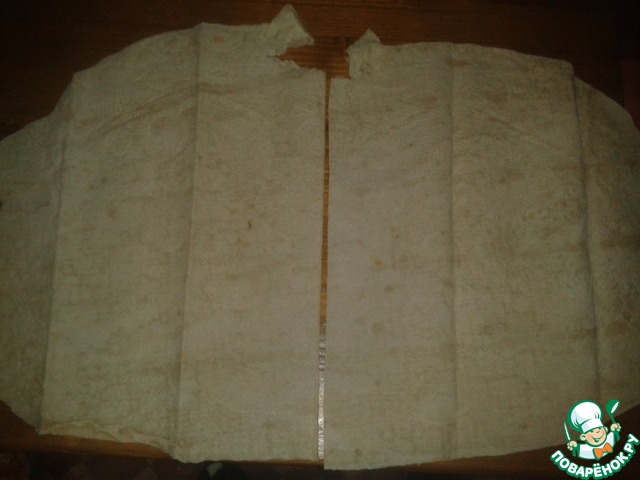 Далее берем обычный тонкий лаваш который продается практически в любом супермаркете, и делим его на две части.