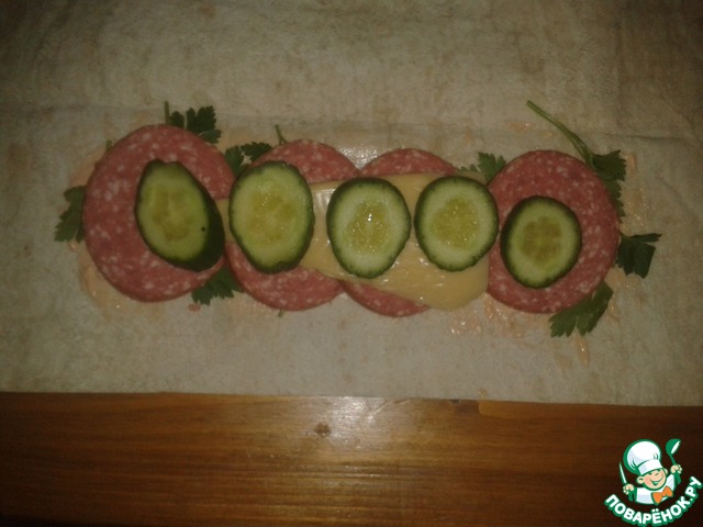 Далее на каждый бутерброд достаточно 4 кружочка колбасы ну и как Вы видите огурчик.