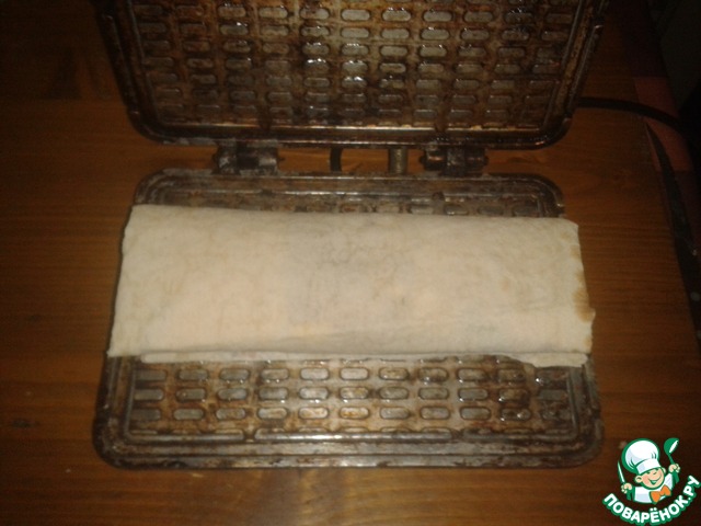 Следующий шаг как говорится каждому свое, можете обжарить на сковороде, я предпочитаю так как я изначально готовил тонкий гамбургер придавить в вафельнице, хочу предупредить что давить сильно не стоит, а то лопнет лаваш и все труды в... или на...