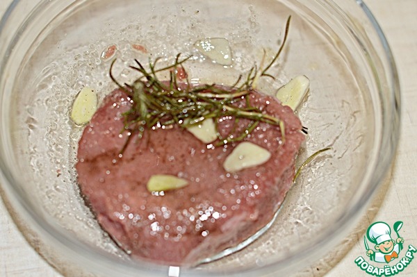 1. Телятину вымыть, обсушить. В чашке смешать масло, соль, перец, нарезанный пластинками чеснок, розмарин. Выложить в чашку мясо, хорошо обмазать в маринаде, накрыть и оставить на 30 минут.