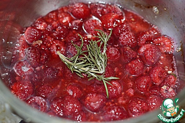 3. Когда малина закипит, добавить веточку розмарина. Проварить пару минут, снять ковш с огня, малину протереть через сито. Протертую смесь вылить снова в ковш.