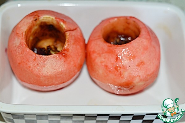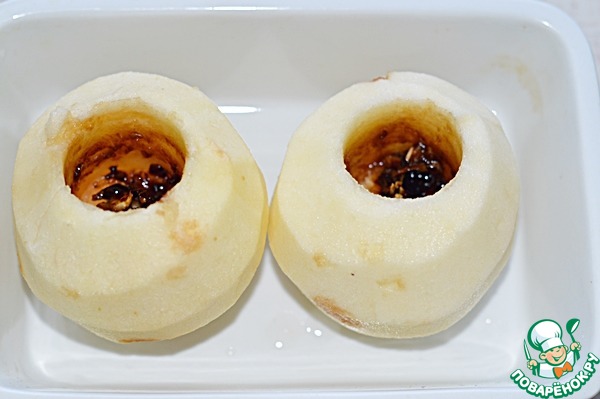 6. Затем форму с яблоками вынуть, заполнить середину сыром и снова поставить яблоки в духовку на 5 минут.