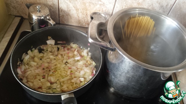 1. Отварить макароны (любой формы) в кипящей воде с 1 столовой ложкой соли. Всегда оставляем стаканчик воды, в которой варились макароны, на случай, если нужно немного разбавить готовое блюдо. Лук мелко порезать и потушить, помешивая, в оливковом масле до приобретения золотистого цвета.