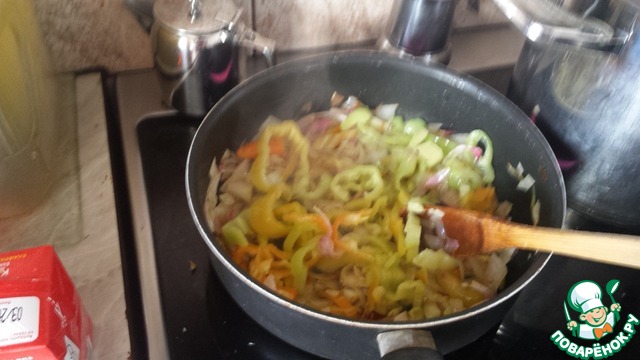 3. Закрыть крышкой и тушить на небольшом огне, иногда помешивая, пока перец не смягчится, и не запахнет как готовый.