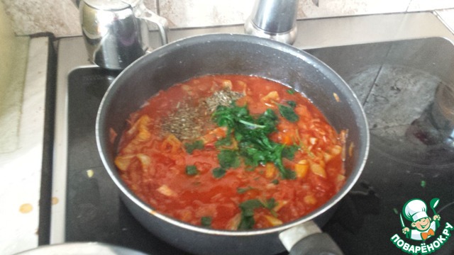 4. Добавить базилик, мелко порубленные помидоры или томатную пасту, соль, перец, петрушку по вкусу.