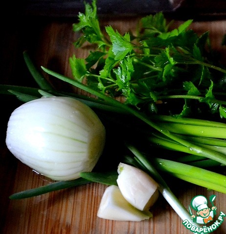 Первым делом нам нужно измельчить зелень, лук и чеснок. Нарезаем все максимально мелко
