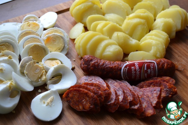 Картофель отварить в мундире. Остудить, почистить, нарезать