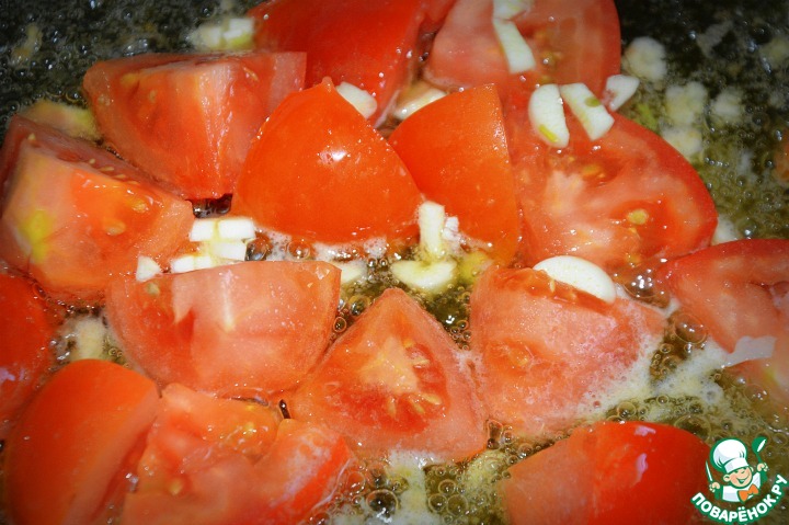 На сковородке растопить сливочное масло с растительным, положить помидоры и чеснок