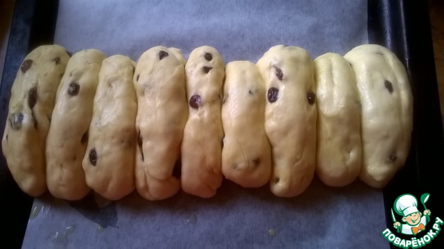 Когда тесто опять поднимется вдвое ( ушло около часа), вмешать в него изюм.
