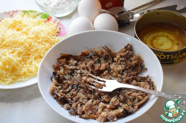 Выложить в одну миску сыр и шпроты, перемешать хорошо, добавить немного масла от шпрот.