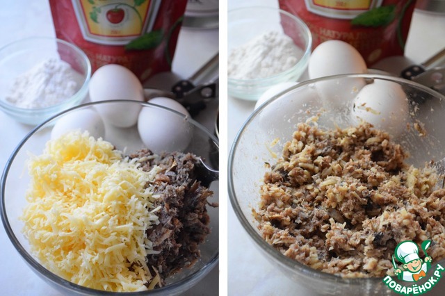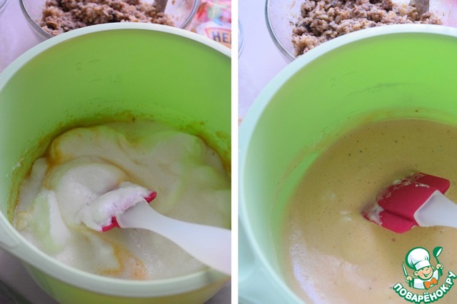 Добавить муку, перемешать. Аккуратно ввести взбитые белки и хорошо перемешать еще раз.