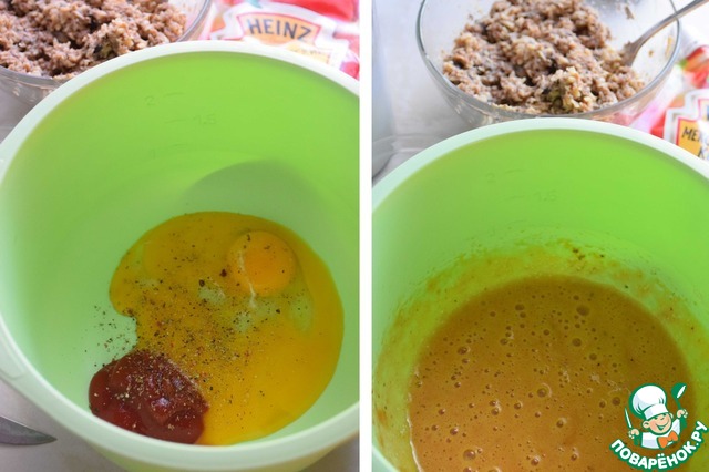 В желтки добавить кетчуп, смесь перцев, (если используете томатную пасту, то добавьте соль по вкусу) и хорошо взбить.