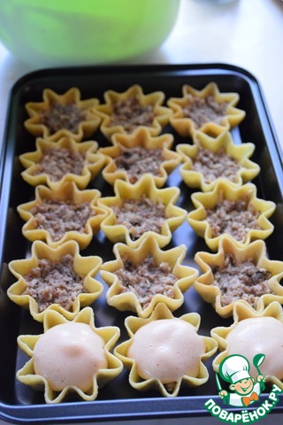 В тарталетки (или корзиночки из теста) выкладываем сырно-шпротную массу (до половины корзиночки), а сверху по 1-2 ч. л. яично-томатной массы.