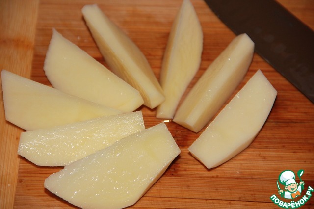Моем, чистим, картофель. Режем его широкими дольками, на 6-8 частей одна картошка.
