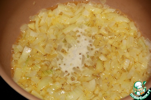 Чистим и режем лук. В мультиварке включаем режим - Жарка-овощи, выкладываем в чашу всё сливочное масло, и поджариваем на нем лук до прозрачности.