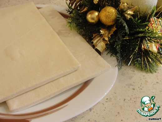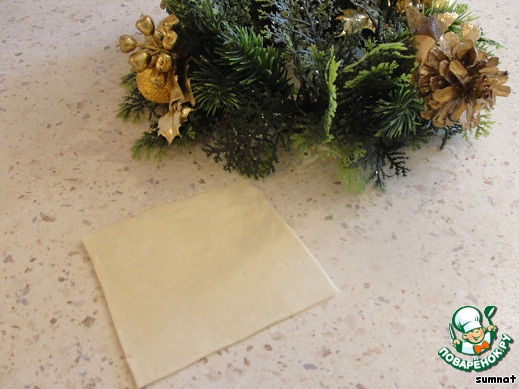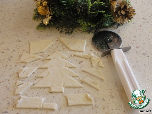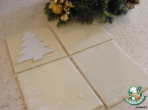 Обрезки от елочек скатаем в шар, раскатаем в пласт толщиной 0,3 см и нарежем на прямоугольники примерно 10 на 8 см.