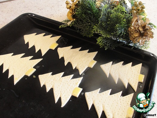 Равномерно наколем вилочкой, смажем «стволы» взбитым яйцом и отправим в духовку на 200 градусов на 10-12 минут. Не передержите, иначе нежные елочные уголки пересохнут и будут сыпаться.