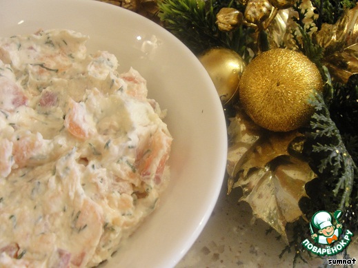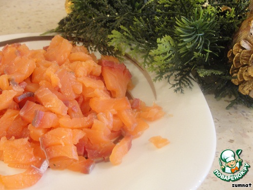 Пока они готовятся, приготовим начинку. Мелко-мелко нарежем малосольную красную рыбку. Можно взять любую – семгу, форель, лосося, горбушу, кету; у меня – покупная подкопченная семга.