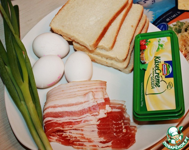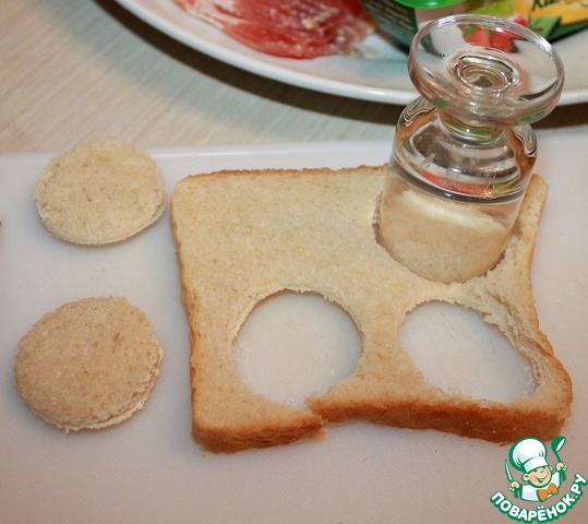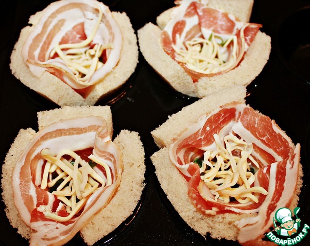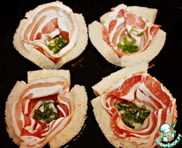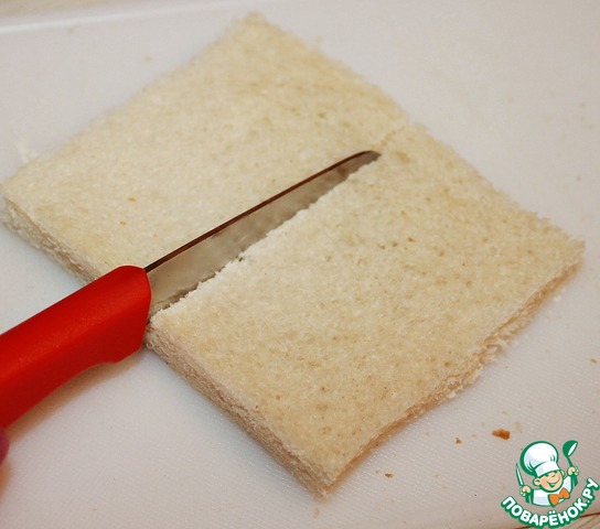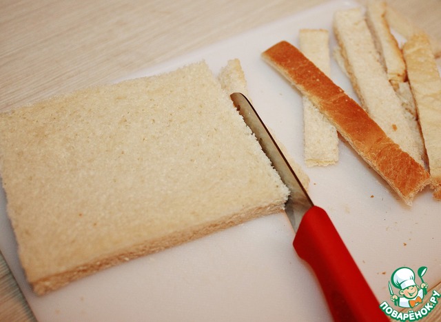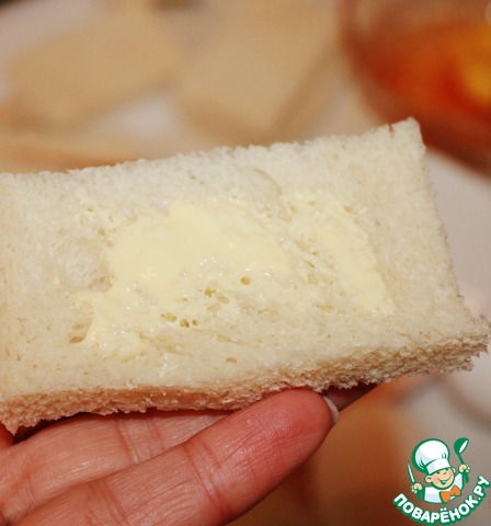 Каждый кусочек намазать плавленым сыром (или сыром типа Филадельфия, можно просто сливочным маслом.)