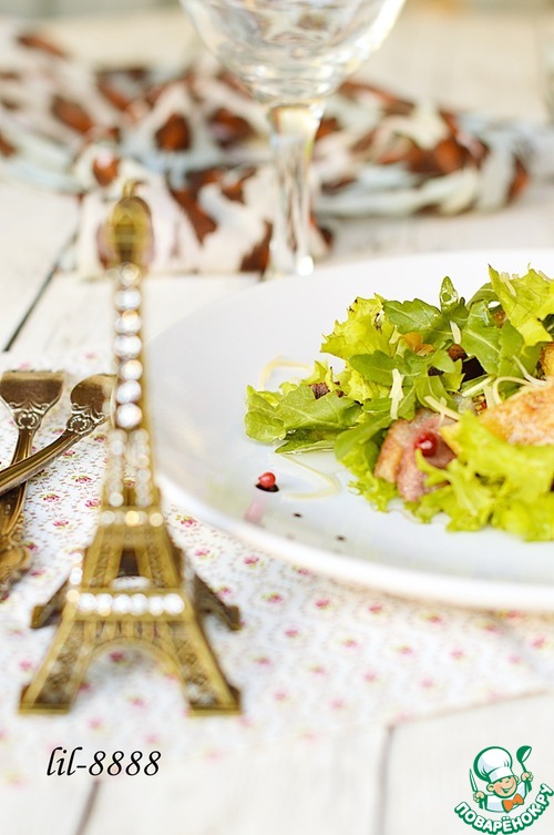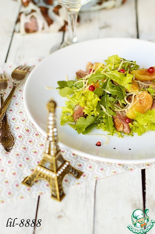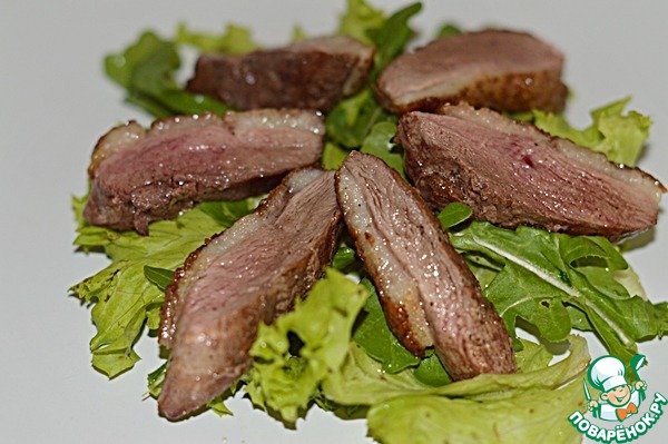 3. Салат вымыть, обсушить. На тарелку выложить горсть салата. Утку нарезать пластинками, выложить на салат.