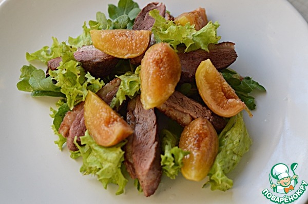 | Вкусный салат из утиной грудки и маринованного инжира. Инжир для маринада нужно брать плотный и целый. Такой инжир можно использовать для гарнира к мясу, а так же как закуску. |