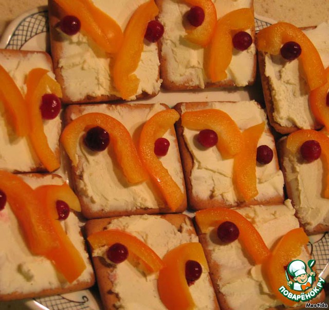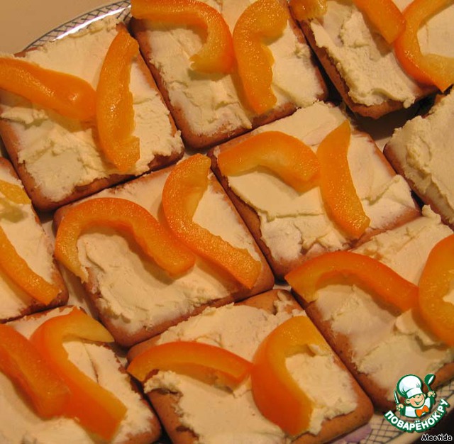 хлебец (или крекер) намазываем сливочным сыром (или творожным, типа Almette), выкладываем несколько ломтиков свежего сладкого перчика