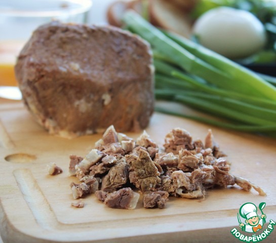 Отварите мясо в подсоленной воде, выньте из бульона и мелко нарежьте.