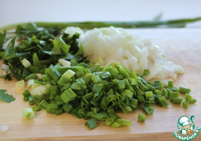 Мелко нарежьте репчатый лук, зеленый лук и петрушку.