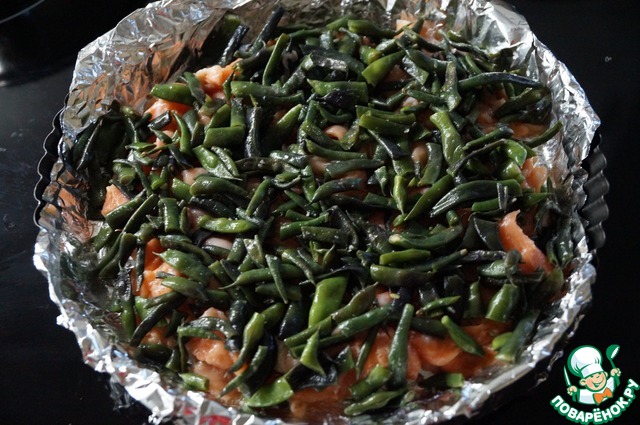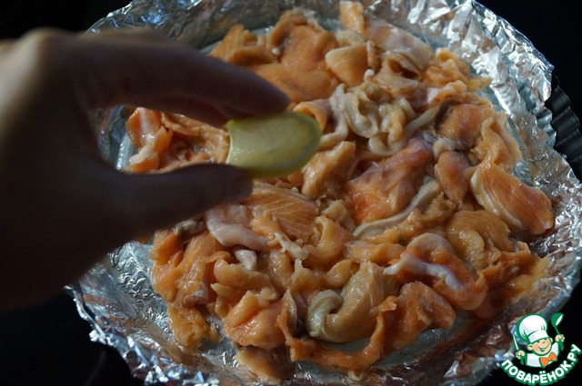 В форму выложить сёмгу, сбрызнуть соком дольки лимона и слегка присолить.