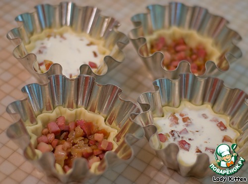На дно формочек положить бекон с луком и залить сметаной с яйцом.