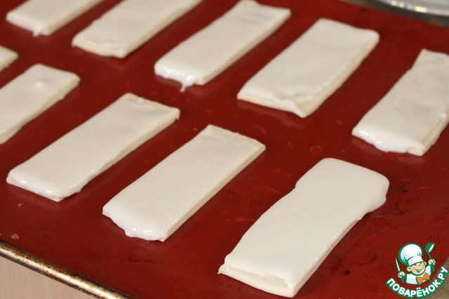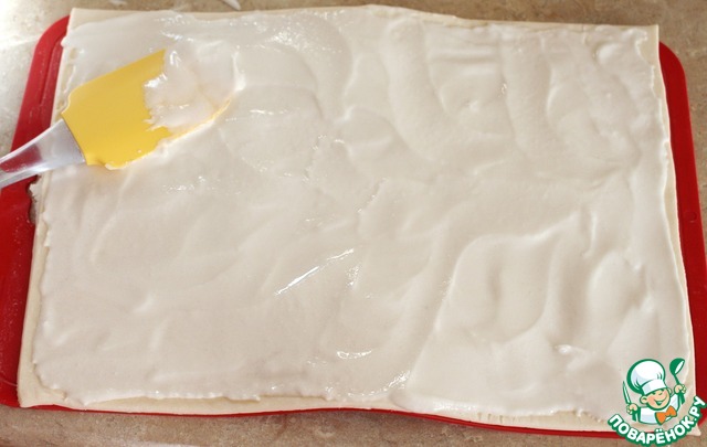 Слоеное тесто (я брала магазинное) раскатать в прямоугольник толщиной 1-1.5 см и шириной 10 см. Длина может быть произвольная. На всю поверхность теста нанести тонким слоем глазурь.