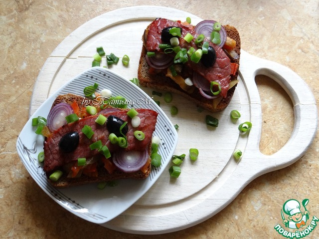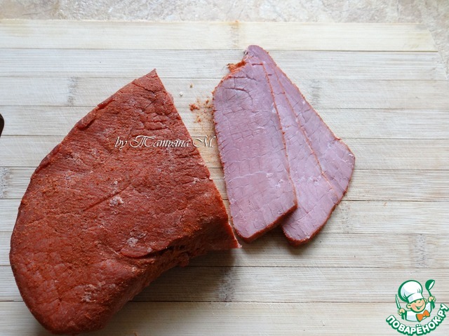 Тонкие ломтики говядины (у меня просоленная су-вид) или ветчины поджарить на оливковом масле до легкой корочки;