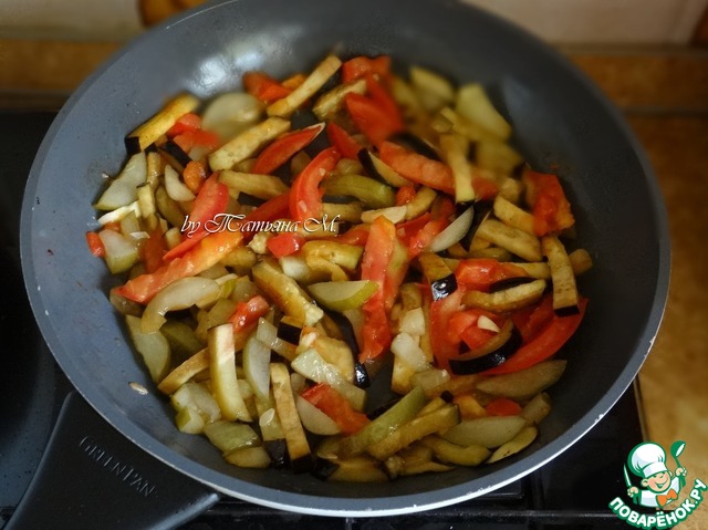 Овощи нашинковать соломкой, поджарить на оливковом масле до готовности баклажана (можно подсолить, я не солила, так как в огурце достаточно соли);